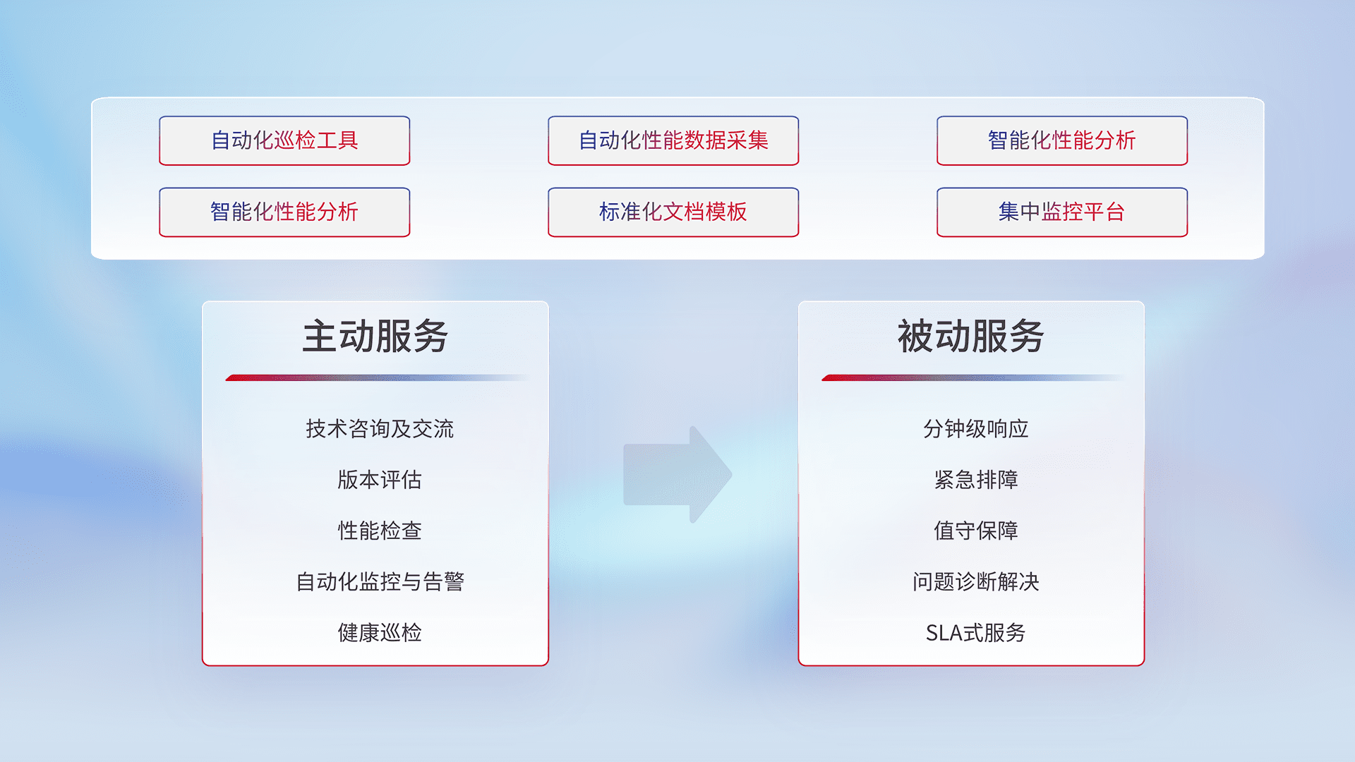 智能化工具和标准化文档,,保障服务质量,,,提供主动服务(包含技术咨询、、版本评估、、性能检查、、、、自动化监控与告警、、、健康巡检)和被动服务包含(分钟级响应、、、、紧急排障、、、值守保障、、问题诊断解决、、、SLA服务)。。